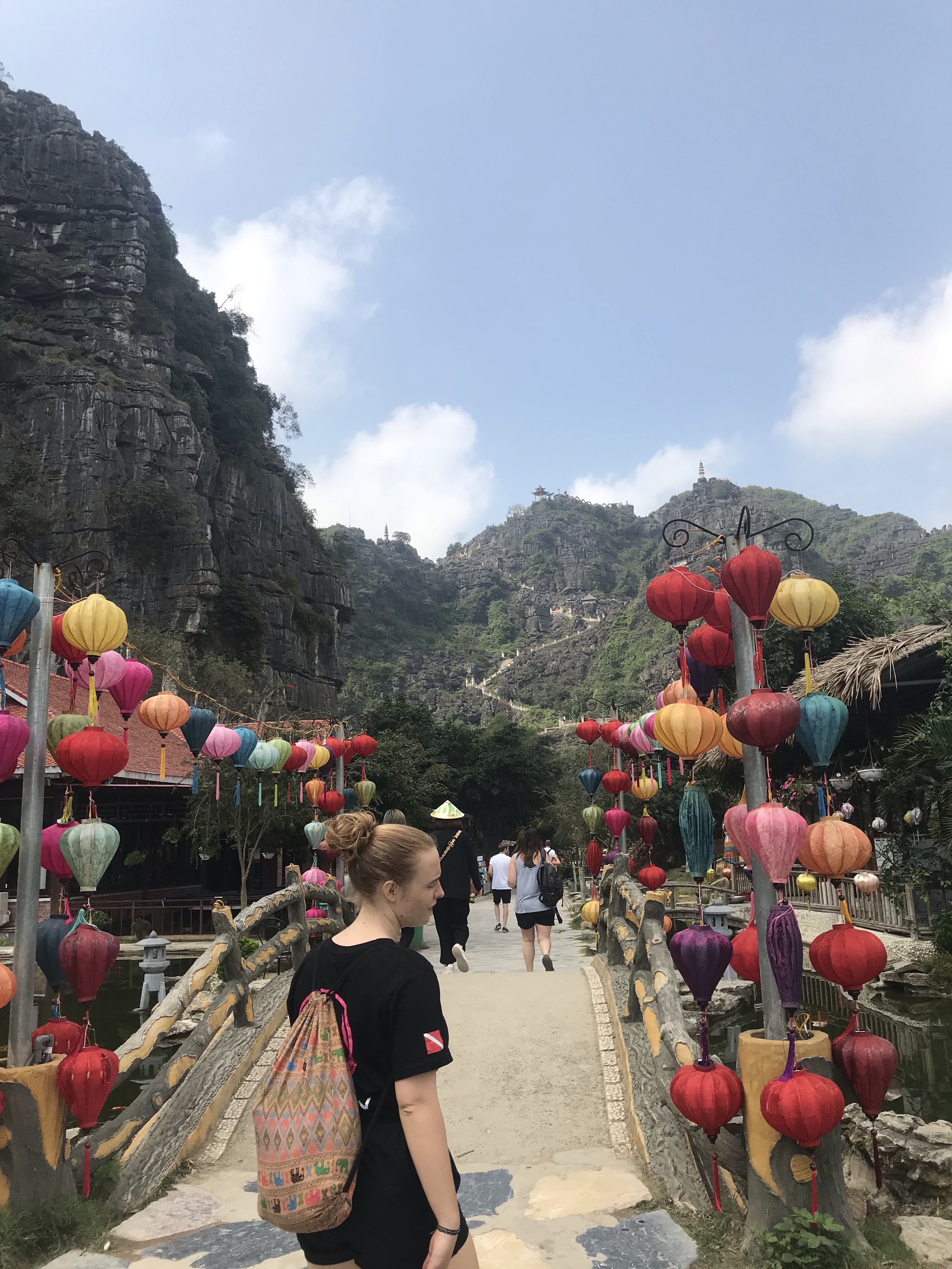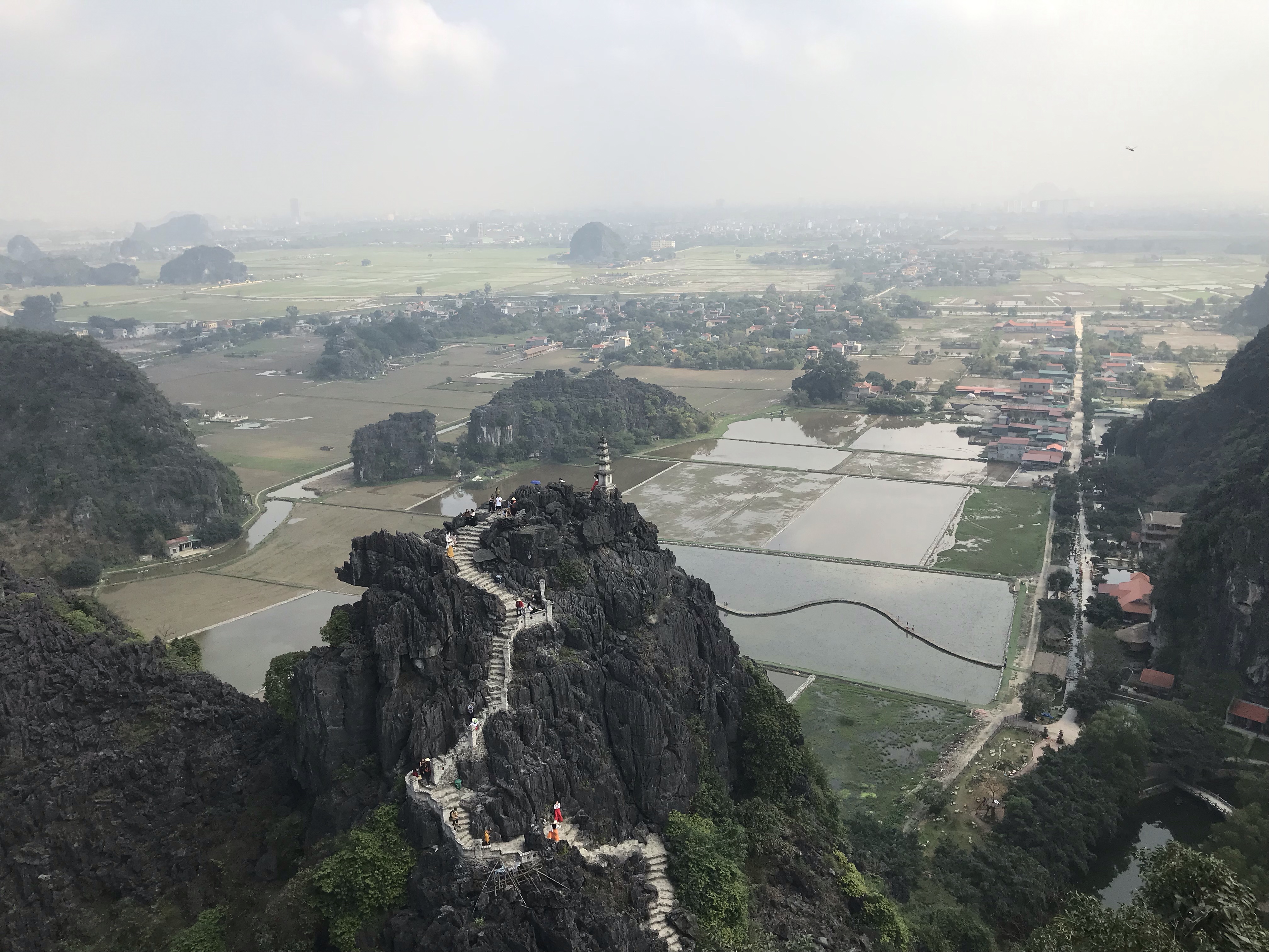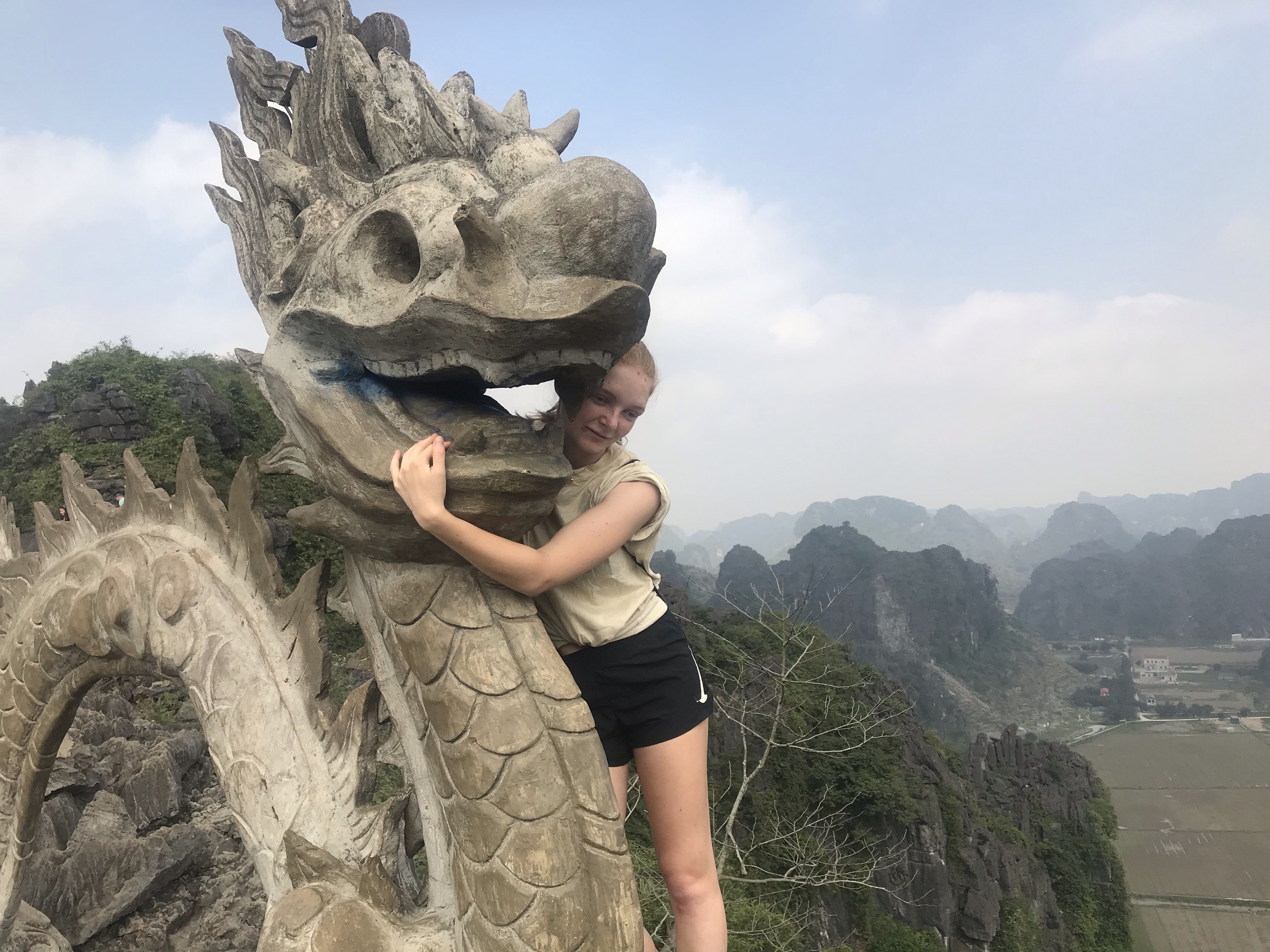 Dag 3, 24 februari = Ebbas födelsedag!! Vi startade dagen med skönsång och frukost på hostelet i vanlig ordning. Sedan hyrde vi cyklar och cyklade över risfält till Hang Mua. Man vandrar upp 500 trappsteg för att se en fantastisk utsikt och en berömd ormstaty. Även här var det många inhemska, fint uppklädda turister.