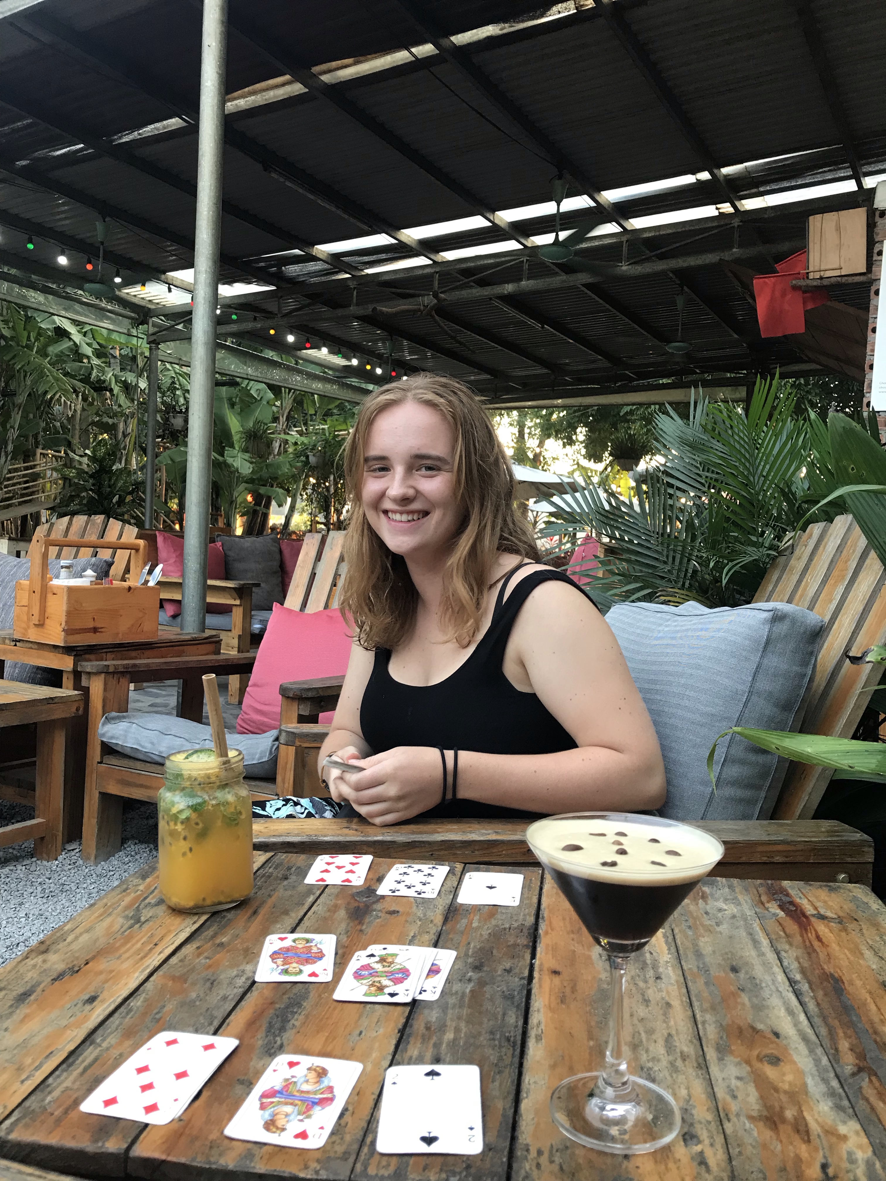 Därefter gick vi till ”chookies” en populär restaurang/bar här. Vi beställde in drinkar; Passionfruit mojito och Espresso martini, och goda vårrullar med frukt och passion-peanut-sås. Oj vad gott! (Många säger stt vi bara skriver om mat, men det är väll det enda intressanta? 😉 )